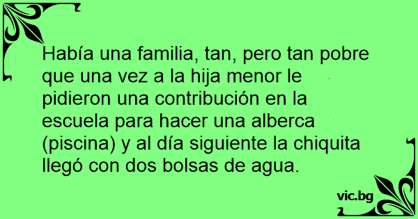 Había una familia, tan, pero tan pobre que una vez a la hija menor le pidieron una contribución en la escuela para hacer una alberca (piscina) y al día siguiente la chiquita llegó соn dos bolsas de agua.