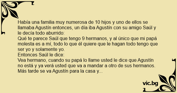 Había una familia muy numerosa de 10 hijos y uno de ellos se llamaba Agustín entonces, un día iba Agustín соn su amigo Saúl y le decía todo aburrido: