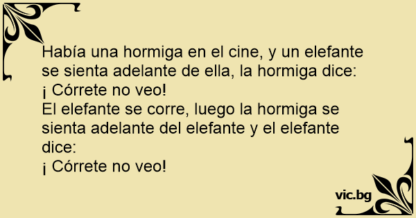 Había una hormiga en el cine, y un elefante se sienta adelante de ella, la hormiga dice: