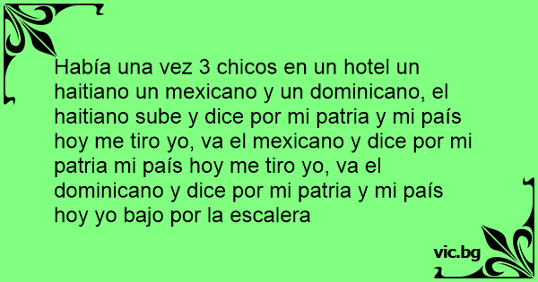 Había una vez 3 chicos en un hotel un haitiano un mexicano y un dominicano, el haitiano sube y dice por mi patria y mi país hoy me tiro yo, va el mexicano y dice por mi patria mi país hoy me tiro yo, va el dominicano y dice por mi patria y mi país hoy yo bajo por la escalera