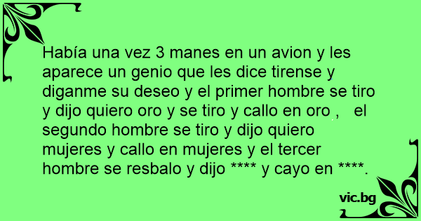 Había una vez 3 manes en un avion y les aparece un genio que les dice tirense y diganme su deseo y el primer hombre se tiro y dijo quiero oro y se tiro y callo en oro , el segundo hombre se tiro y dijo quiero mujeres y callo en mujeres y el tercer hombre se resbalo y dijo **** y cayo en ****.