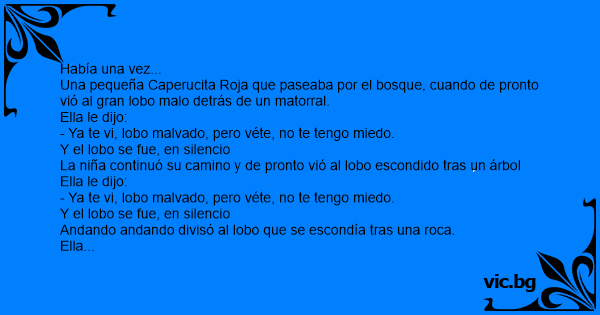 Црвенкапа Rotkäppchen und der Wolf Червената Шапчица си върви из гората и вижда в храстите Кумчо Вълчо с очи като палачинки. C'est le petit chaperon rouge qui va apporter une galette à sa grand-mère. Rotkäppchen: Das Rotkäppchen geht durch den Wald, da trifft es den bösen Wolf hinter einem Busch. Das kleine Rotkäppchen schlendert durch den Wald in Richtung Großmutters Haus. Sie hat wie üblich ihren Korb mit. Rotkäppchen: "Aber Wolf, warum hast Du so große Augen?" Darauf der Wolf: "Verflixt noch mal, kann man denn hier nicht mal in Ruhe kacken!" ¡Que orejas mas rojas tienes Lobo! Sí... ¡Lobo, que hinchadas tienes las venas del cuello! Sí... ¡ Lobo, que cara más colorada tienes! Sí... !Lobo, que apretados tienes los dientes! Coño Caperucita, ¿me quieres dejar cagar en paz? Estaba Caperucita cantando en el bosque y vio al lobo y dijo: - Ya te vi lobo, estás detrás de ese árbol, y volvió a cantar tranquilamente. De nuevo lo ve al lobo y dice: - Ya te vi lobo, estás detrás de ese arbusto, y volvió a cantar. Se lo encuentra de nuevo y dice Caperucita: - Ya te vi lobo,... Iba caminando la Caperucita Roja por el bosque, cuando de repente se encuentra al lobo feroz y esta le dice: - ¡Qué orejas más rojas tienes Lobo! - Sí... - ¡Lobo, qué hinchadas tienes las venas del cuello! - Sí... - ¡Lobo, qué cara más colorada tienes! - Sí... - ¡Lobo, qué apretados tienes los... Le petit chaperon rouge va voir sa grand-mère quand, tout à coup, elle aperçoit le grand méchant loup tapi derrière un buisson. - Oh ! Comme vous avez de grands yeux, lui dit-elle. Et le loup s'enfuit sans demander son reste... Un peu plus loin sur son chemin, le petit chaperon rouge voit le même... Idzie Czerwony Kapturek przez las, nagle zauważyła wilka: - Wilku, dlaczego masz takie wielki oczy? - Myk, myk Czerwony Kapturku - nie widzisz, że sram? Rotkäppchen geht durch den Wald und trifft hinter einem Gebüsch den bösen Wolf. Fragt Rotkäppchen: "Du Wolf, warum hast du denn so große Augen?" Darauf der Wolf: "Nicht mal in Ruhe scheißen kann... Llega caperucita donde su abuelita y le dice: - ¿Abuelita, porque tienes los ojos tan grandes? - ¡Cállate y déjame cagar en paz! Va Caperucita Roja por el bosque y ve unas orejas detrás de unos arbustos: - Lobo Feroz, Lobo Feroz, que te estoy viendo... Las orejas desaparecen y Caperucita sigue caminando. A los cien metros,... Caperucita se encuentra con el lobo en medio del bosque y le dice: - Lobo, ¡qué orejas más coloradas tienes! - Sí... - Lobo, ¡qué cara más roja tienes! - Sí... - Y... ¡qué hinchadas tienes las... Chapeuzinho Vermelho está andando pela floresta, para levar seus docinhos para vovozinha, quando vê uma moita se mexendo. Sem conseguir conter a sua curiosidade, espia atrás da moita e dá de cara... Rødhætte Den lille Rødhætte er på vej igennem skoven for at besøge sin bedstemor. Pludselig får hun øje på ulven, som sidder på hug bag en busk. - "Hvorfor har du sådan nogle store ører? - "Det er... Roodkapje komt in het bos en ziet opeens de boze wolf achter een boom zitten. Ze loopt er naartoe en zegt: "Wolf wat heb je klein oogjes." Waarop de wolf antwoordt: "Rot op, ik zit te schijten." Det var lille Rødhætte, som var ude i skoven Det var lille Rødhætte, som var ude i skoven. Der mødte hun den store stykke ulv. Hvorfor har du så store øre? spurgte hun. Det er for jeg bedre kan... -Lobo, que orejas mas coloradotas tienes! - Si... - Lobo, que cara más roja tienes! - Si... - Lobo, que hinchadas tienes las venas del cuello! - Si... - Lobo, que apretados tienes los dientes! -... Va Caperucita Roja cantando por el bosque: - Soy Caperucita Roja, una niña muy feliz... Cuando de pronto ve al lobo y le dice: - Señor Lobo, ¡ya lo vi detrás de ese árbol! El lobo sale... Intr-o zi Scufita Rosie se ducea la bunicuta. Deodata apare de dupa un tufis capul unui lup. Scufita Rosie il intreaba: - Lupule, de ce ai urechile atat de mari? - Ca sa aud mai bine. - Lupule, dar... Punahilkka oli menossa viemään isoäidilleen eväskoria ja joutui kävelemään metsän halki. Yhtäkkiä hän näki pusikossa ison pahan suden. Hän kysyi: - Miksi sinulla on niin suuret silmät? Johon iso...