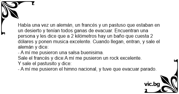 Había una vez un alemán, un francés y un pastuso que estaban en un desierto y tenían todos ganas de evacuar. Encuentran una persona y les dice que a 2 kilómetros hay un baño que cuesta 2 dólares y ponen musica excelente. Cuando llegan, entran, y sale el alemán y dice: