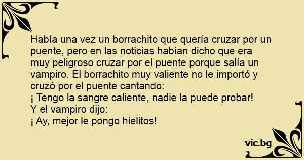 Había una vez un borrachito que quería cruzar por un puente, pero en las noticias habían dicho que era muy peligroso cruzar por el puente porque salía un vampiro. El borrachito muy valiente no le importó y cruzó por el puente cantando: