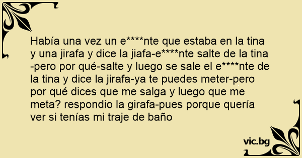 Había una vez un e****nte que estaba en la tina y una jirafa y dice la jiafa-e****nte salte de la tina-pero por qué-salte y luego se sale el e****nte de la tina y dice la jirafa-ya te puedes meter-pero por qué dices que me salga y luego que me meta? respondio la girafa-pues porque quería ver si tenías mi traje de baño