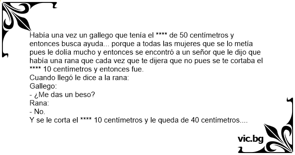 Había una vez un gallego que tenía el **** de 50 centímetros y entonces busca ayuda... porque a todas las mujeres que se lo metía pues le dolía mucho y entonces se encontró a un señor que le dijo que había una rana que cada vez que te dijera que no pues se te cortaba el **** 10 centímetros y entonces fue.