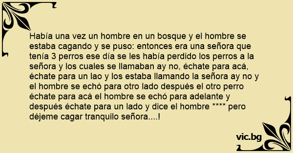 Había una vez un hombre en un bosque y el hombre se estaba cagando y se puso: entonces era una señora que tenía 3 perros ese día se les había perdido los perros a la señora y los cuales se llamaban ay no, échate para acá, échate para un lao y los estaba llamando la señora ay no y el hombre se echó para otro lado después el otro реrrо échate para acá el hombre se echó para adelante y después échate para un lado y dice el hombre **** pero déjeme саgаr tranquilo señora....!