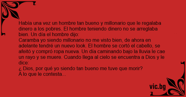 Caramba yo siendo millonario no me visto bien, de ahora en adelante tendré un nuevo look. El hombre se cortó el cabello, se afeitó y compró ropa nueva. Un día caminando bajo la lluvia le cae un rayo y se muere. Cuando llega al cielo se encuentra a Dios y le dice: