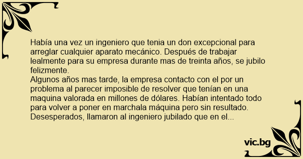 Había una vez un ingeniero que tenia un don excepcional para arreglar cualquier aparato mecánico. Después de trabajar lealmente para su empresa durante mas de treinta años, se jubilo felizmente.