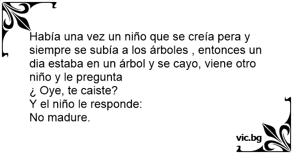 Había una vez un niño que se creía pera y siempre se subía a los árboles , entonces un dia estaba en un árbol y se cayo, viene otro niño y le pregunta
