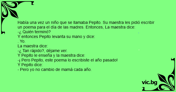 Había una vez un niño que se llamaba Pepito. Su maestra les pidió escribir un poema para el día de las madres. Entonces, La maestra dice: