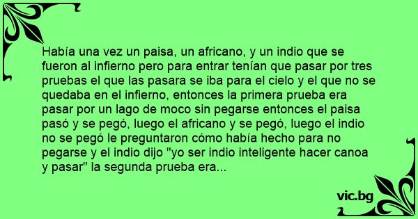 Había una vez un paisa, un africano, y un indio que se fueron al infierno pero para entrar tenían que pasar por tres pruebas el que las pasara se iba para el cielo y el que no se quedaba en el infierno, entonces la primera prueba era pasar por un lago de moco sin pegarse entonces el paisa pasó y se pegó, luego el africano y se pegó, luego el indio no se pegó le preguntaron cómo había hecho para no pegarse y el indio dijo "yo ser indio inteligente hacer canoa y pasar" la segunda prueba era pasar por el fuego sin quemarse entonces pasó el paisa y el africano y se quemaron pero el indio no se quemó entonces le preguntaron cómo hizo para no quemarse y el indio dijo "yo ser indio inteligente saltar y soplar" y la siguiente prueba era pasar por un camino lleno de mujeres desnudas y no quedarse mirándolas ni seducirse entonces paso el paisa y se quedó mirándolas pasó el africano y se quedó mirándolas pero pasó el indio y no las miró le preguntaron que cómo hizo y el indio dijo "yo ser indio inteligente, ser ****"