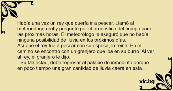 Había una vez un rey que quería ir a pescar. Llamó al meteorólogo real y preguntó por el pronóstico del tiempo para las próximas horas. El meteorólogo le aseguró que no había ninguna posibilidad de lluvia en los próximos días.