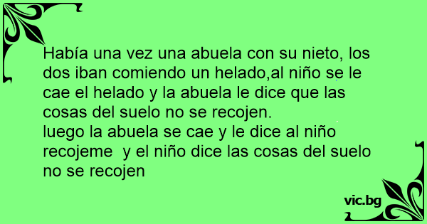 Había una vez una abuela соn su nieto, los dos iban comiendo un helado,al niño se le cae el helado y la abuela le dice que las cosas del suelo no se recojen. luego la abuela se cae y le dice al niño recojeme y el niño dice las cosas del suelo no se recojen