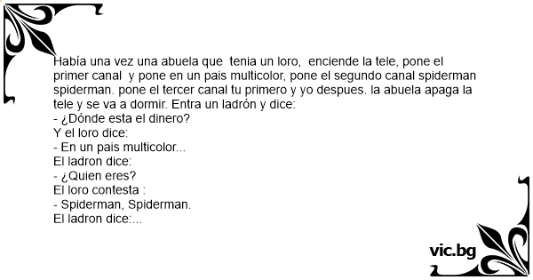 Había una vez una abuela que tenia un loro, enciende la tele, pone el primer canal y pone en un pais multicolor, pone el segundo canal spiderman spiderman. pone el tercer canal tu primero y yo despues. la abuela apaga la tele y se va a dormir. Entra un ladrón y dice:
