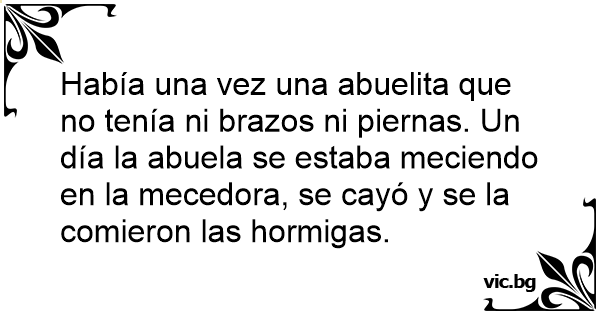 Había una vez una abuelita que no tenía ni brazos ni piernas. Un día la abuela se estaba meciendo en la mecedora, se cayó y se la comieron las hormigas.