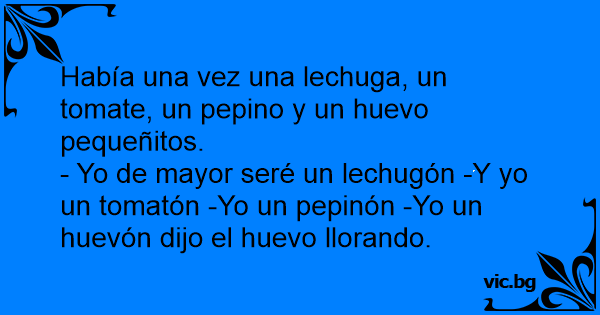 - Yo de mayor seré un lechugón -Y yo un tomatón -Yo un pepinón -Yo un huеvón dijo el huеvо llorando.