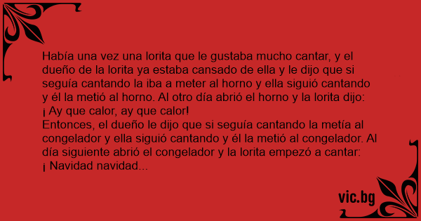 Había una vez una lorita que le gustaba mucho cantar, y el dueño de la lorita ya estaba cansado de ella y le dijo que si seguía cantando la iba a meter al horno y ella siguió cantando y él la metió al horno. Al otro día abrió el horno y la lorita dijo: