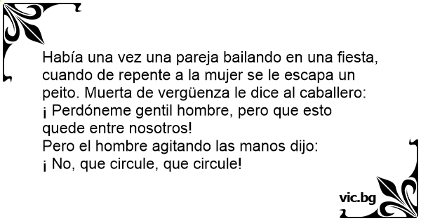 Había una vez una pareja bailando en una fiesta, cuando de repente a la mujer se le escapa un peito. Muerta de vergüenza le dice al caballero:
