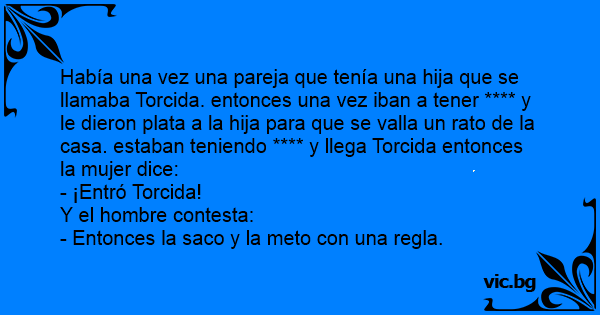 Había una vez una pareja que tenía una hija que se llamaba Torcida. entonces una vez iban a tener **** y le dieron plata a la hija para que se valla un rato de la casa. estaban teniendo **** y llega Torcida entonces la mujer dice: