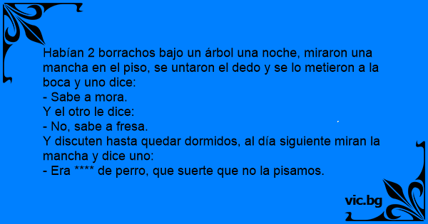 Habían 2 borrachos bajo un árbol una noche, miraron una mancha en el piso, se untaron el dedo y se lo metieron a la boca y uno dice: