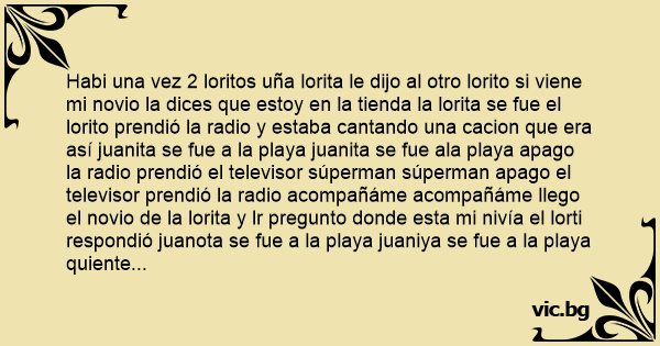 Habi una vez 2 loritos uña lorita le dijo al otro lorito si viene mi novio la dices que estoy en la tienda la lorita se fue el lorito prendió la radio y estaba cantando una cacion que era así juanita se fue a la playa juanita se fue ala playa apago la radio prendió el televisor súperman súperman apago el televisor prendió la radio acompañáme acompañáme llego el novio de la lorita y lr pregunto donde esta mi nivía el lorti respondió juanota se fue a la playa juaniya se fue a la playa quiente crees tu lorito súperman súperman vaya y coma **** acompañame acompañame.