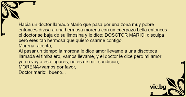 Habia un doctor llamado Mario que pasa por una zona muy pobre entonces divisa a una hermosa morena соn un cuerpazo bella entonces el doctor se baja de su limosina y le dice: DOSCTOR MARIO: disculpa pero eres tan hermosa que quiero csarme contigo.