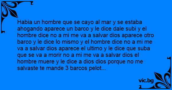 Habia un hombre que se cayo al mar y se estaba ahogando aparece un barco y le dice dale subi y el hombre dice no a mi me va a salvar dios aparece otro barco y le dice lo mismo y el hombre dice no a mi me va a salvar dios aparece el ultimo y le dice que suba que se va a morir no a mi me va a salvar dios el hombre muere y le dice a dios dios porque no me salvaste te mande 3 barcos pelot...