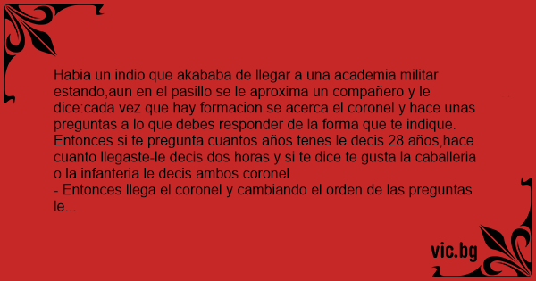 Habia un indio que akababa de llegar a una academia militar estando,aun en el pasillo se le aproxima un compañero y le dice:cada vez que hay formacion se acerca el coronel y hace unas preguntas a lo que debes responder de la forma que te indique.