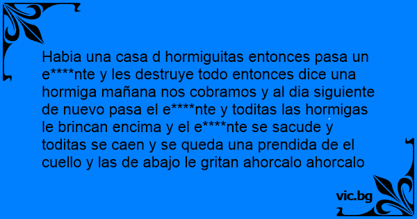 Habia una casa d hormiguitas entonces pasa un e****nte y les destruye todo entonces dice una hormiga mañana nos cobramos y al dia siguiente de nuevo pasa el e****nte y toditas las hormigas le brincan encima y el e****nte se sacude y toditas se caen y se queda una prendida de el cuello y las de abajo le gritan ahorcalo ahorcalo
