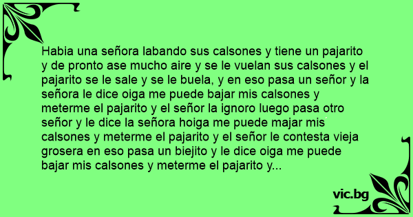 Habia una señora labando sus calsones y tiene un pajarito y de pronto ase mucho aire y se le vuelan sus calsones y el pajarito se le sale y se le buela, y en eso pasa un señor y la señora le dice oiga me puede bajar mis calsones y meterme el pajarito y el señor la ignoro luego pasa otro señor y le dice la señora hoiga me puede majar mis calsones y meterme el pajarito y el señor le contesta vieja grosera en eso pasa un biejito y le dice oiga me puede bajar mis calsones y meterme el pajarito y le dice el biejito aunque tenga el pajarito arrugadito.
