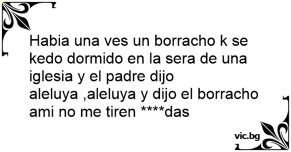 Habia una ves un borracho k se kedo dormido en la sera de una iglesia y el padre dijo aleluya ,aleluya y dijo el borracho ami no me tiren ****das