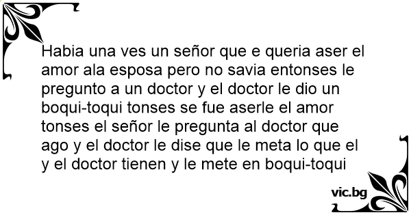 Habia una ves un señor que e queria aser el amor ala esposa pero no savia entonses le pregunto a un doctor y el doctor le dio un boqui-toqui tonses se fue aserle el amor tonses el señor le pregunta al doctor que ago y el doctor le dise que le meta lo que el y el doctor tienen y le mete en boqui-toqui