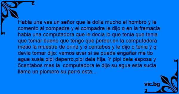 Habia una ves un señor que le dolia mucho el hombro y le comento al compadre y el compadre le dijo q en la framacia habia una computadora que le decia lo que tenia que tenia que tomar bueno que tengo que perder,en la computadora metio la muestra de orina y 5 centabos y le dijo q tenia y q devia tomar dijo: vamos aver si se puede engañar me tio agua susia pipi deperro,pipi dela hija. Y pipi dela esposa y 5centabos mas la computadora le dijo su agua esta sucia llame un plomero su реrrо esta emfreno llevelo a un veterinario , su hij se droga com coca llevela a un cicologo y su esposa tiene 2 meses de embarazoy usted es esteril busque un abogado