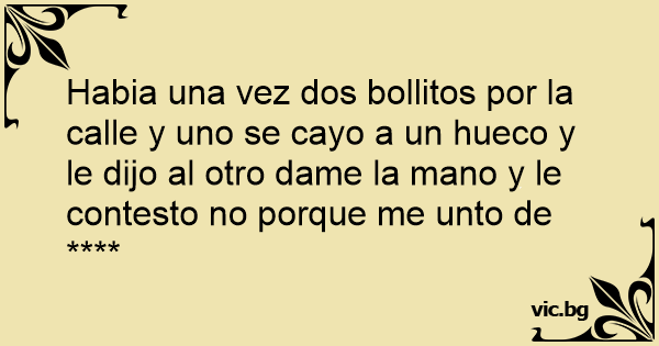 Habia una vez dos bollitos por la calle y uno se cayo a un hueco y le dijo al otro dame la mano y le contesto no porque me unto de ****