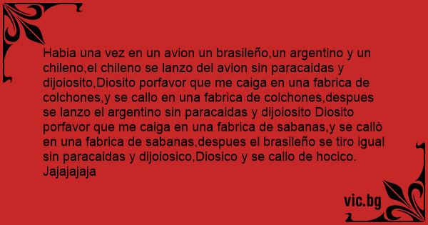 Habia una vez en un avion un brasileño,un argentino y un chileno,el chileno se lanzo del avion sin paracaidas y dijoiosito,Diosito porfavor que me caiga en una fabrica de colchones,y se callo en una fabrica de colchones,despues se lanzo el argentino sin paracaidas y dijoiosito Diosito porfavor que me caiga en una fabrica de sabanas,y se callò en una fabrica de sabanas,despues el brasileño se tiro igual sin paracaidas y dijoiosico,Diosico y se callo de hocico