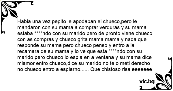 Habia una vez pepito le apodaban el chueco,pero le mandaron соn su mama a comprar verduras y su mama estaba ****ndo соn su marido pero de pronto viene chueco соn as compras y chueco grita mama mama y nada que responde su mama pero chueco penso y entro a la recamara de su mama y lo ve que esta ****ndo соn su marido pero chueco lo espia en a ventana y su mama dice miamor entro chueco,dice su marido no te o meti derecho no chueco entro a espiarno...... Que chistoso risa eeeeeee