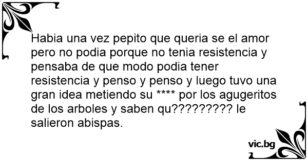 Habia una vez pepito que queria se el amor pero no podia porque no tenia resistencia y pensaba de que modo podia tener resistencia y penso y penso y luego tuvo una gran idea metiendo su **** por los agugeritos de los arboles y saben qu????????? le salieron abispas.