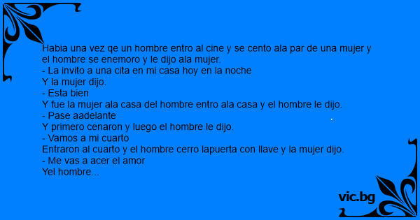 Habia una vez qe un hombre entro al cine y se cento ala par de una mujer y el hombre se enemoro y le dijo ala mujer.