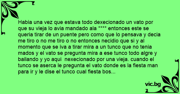 Habia una vez que estava todo dexecionado un vato por que su vieja lo avia mandado ala **** entonces este se queria tirar de un puente pero como que lo pensava y decia me tiro o no me tiro o no entonces necidio que si y al momento que se iva a tirar mira a un tunco que no tenia mados y el vato se pregunta mira a ese tunco todo algre y bailando y yo aqui nexecionado por una vieja. cuando el tunco se aserca le pregunta el vato donde es la fiesta man para ir y le dise el tunco cual fiesta bos es me рiса el сulо y no me lo puedo rascar
