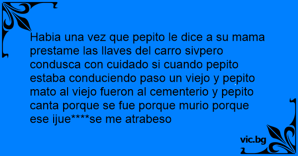 Habia una vez que pepito le dice a su mama prestame las llaves del carro sivpero condusca соn cuidado si cuando pepito estaba conduciendo paso un viejo y pepito mato al viejo fueron al cementerio y pepito canta porque se fue porque murio porque ese ijue****se me atrabeso