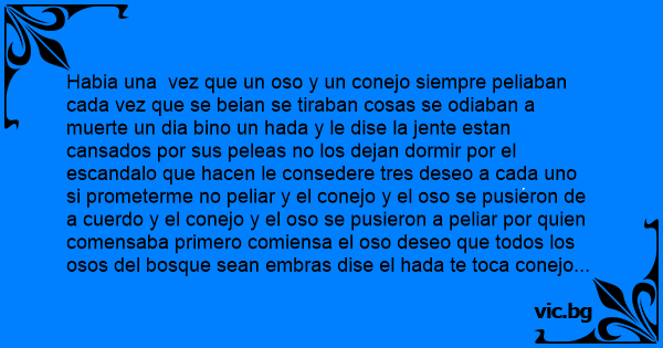 Habia una vez que un oso y un conejo siempre peliaban cada vez que se beian se tiraban cosas se odiaban a muerte un dia bino un hada y le dise la jente estan cansados por sus peleas no los dejan dormir por el escandalo que hacen le consedere tres deseo a cada uno si prometerme no peliar y el conejo y el oso se pusieron de a cuerdo y el conejo y el oso se pusieron a peliar por quien comensaba primero comiensa el oso deseo que todos los osos del bosque sean embras dise el hada te toca conejo deseo tener un casco demoto dise el oso me toca el segundo deseo deseo que todos los osos del pais sean embras dice el hada parese que te vaz a dibertir mucho dice el hada te toca conejo deseo tener una moto tu turno oso deseo que tos lo osos del planeta sean embras y dice el hada mijo te vaz a poner morado tu vaz hacer el uica hombre entre tantas mujeres dice el ada te toca conejo espero que sea bueno el conejo poniendo se el casco y arancando en la moto dijo deseo que el oso se gay