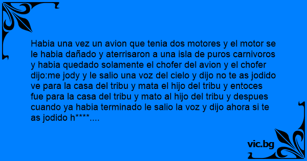 Habia una vez un avion que tenia dos motores y el motor se le habia dañado y aterrisaron a una isla de puros carnivoros y habia quedado solamente el chofer del avion y el chofer dijo:me jody y le salio una voz del cielo y dijo no te as jodido ve para la casa del tribu y mata el hijo del tribu y entoces fue para la casa del tribu y mato al hijo del tribu y despues cuando ya habia terminado le salio la voz y dijo ahora si te as jodido h****....