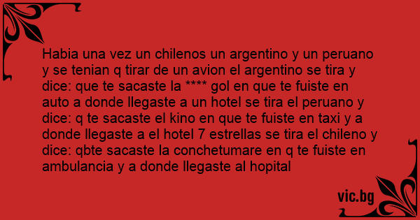 Habia una vez un chilenos un argentino y un peruano y se tenian q tirar de un avion el argentino se tira y dice: que te sacaste la **** gol en que te fuiste en auto a donde llegaste a un hotel se tira el peruano y dice: q te sacaste el kino en que te fuiste en taxi y a donde llegaste a el hotel 7 estrellas se tira el chileno y dice: qbte sacaste la conchetumare en q te fuiste en ambulancia y a donde llegaste al hopital