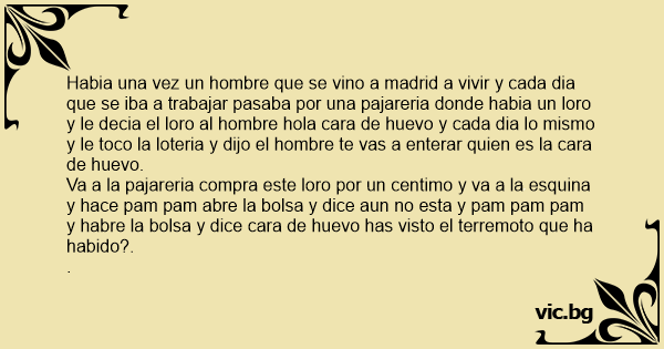 Habia una vez un hombre que se vino a madrid a vivir y cada dia que se iba a trabajar pasaba por una pajareria donde habia un loro y le decia el loro al hombre hola cara de huеvо y cada dia lo mismo y le toco la loteria y dijo el hombre te vas a enterar quien es la cara de huеvо.