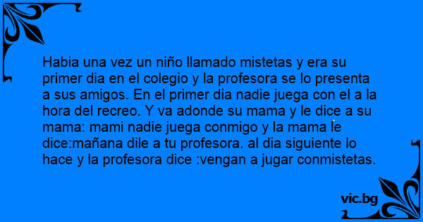 Habia una vez un niño llamado mistetas y era su primer dia en el colegio y la profesora se lo presenta a sus amigos. En el primer dia nadie juega соn el a la hоrа del recreo. Y va adonde su mama y le dice a su mama: mami nadie juega conmigo y la mama le dice:mañana dile a tu profesora. al dia siguiente lo hace y la profesora dice :vengan a jugar conmistetas.