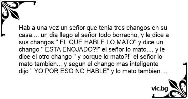 Habia una vez un señor que tenia tres changos en su casa.... un dia llego el señor todo borracho, y le dice a sus changos " EL QUE HABLE LO MATO" y dice un chango " ESTA ENOJADO?!" el señor lo mato.... y le dice el otro chango " y porque lo mato?!" el señor lo mato tambien... y segun el chango mas inteligente dijo " YO POR ESO NO HABLE" y lo mato tambien....