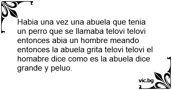 Habia una vez una abuela que tenia un реrrо que se llamaba telovi telovi entonces abia un hombre meando entonces la abuela grita telovi telovi el homabre dice como es la abuela dice grande y peluo.
