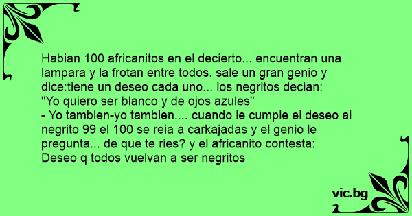 Habian 100 africanitos en el decierto... encuentran una lampara y la frotan entre todos. sale un gran genio y dice:tiene un deseo cada uno... los negritos decian: