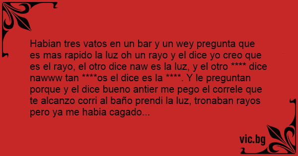 Habian tres vatos en un bar y un wey pregunta que es mas rapido la luz oh un rayo y el dice yo creo que es el rayo, el otro dice naw es la luz, y el otro **** dice nawww tan ****os el dice es la ****. Y le preguntan porque y el dice bueno antier me pego el correle que te alcanzo corri al baño prendi la luz, tronaban rayos pero ya me habia cagado...